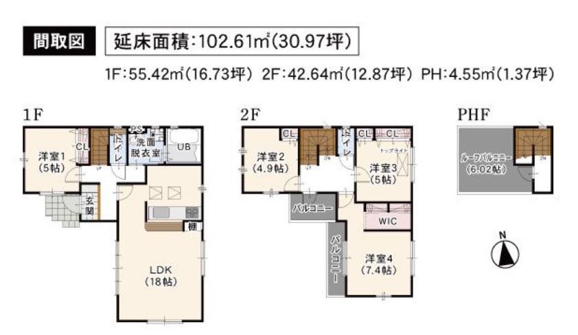 | 間取 | 4LDK + ルーフバルコニ:6.02帖 (LDK18帖、洋室5帖、洋室4.9帖、洋室5帖、洋室7.4帖) | ||