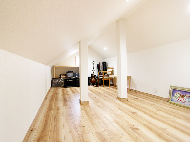 固定階段式グルニエは重い荷物も両手で安全に運べます。アウトドア用品や季節物の収納はもちろん、コレクションルームやお子様の秘密基地など用途無限大です。[施工例:グルニエ]