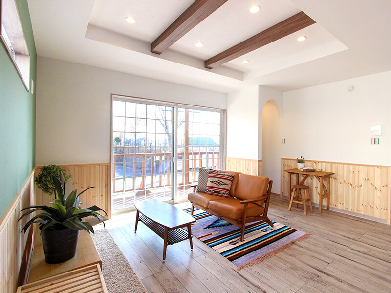 飾り梁×腰壁で木の温かみを感じるナチュラルな空間に。[施工例:LDK]