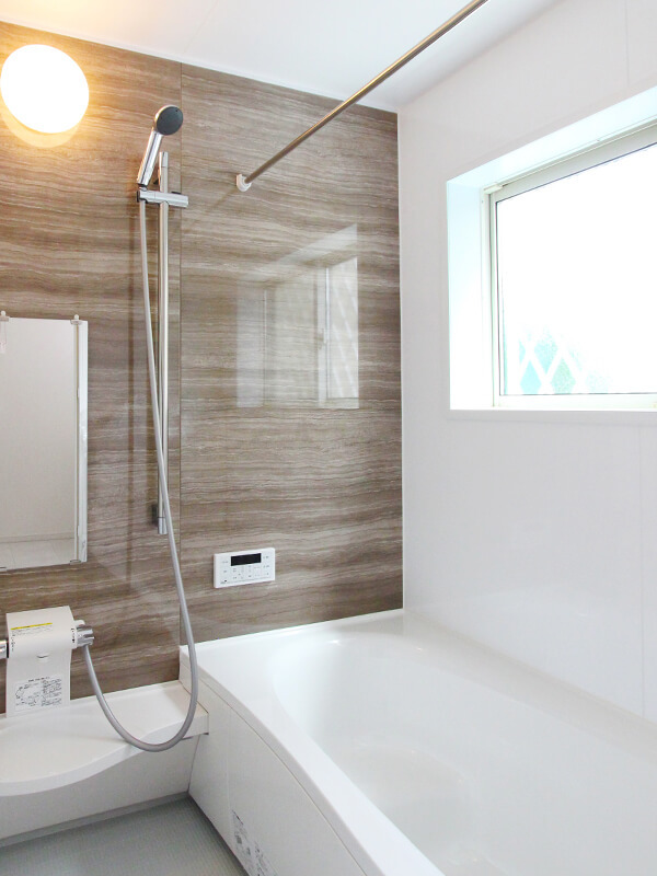 暖房換気乾燥機付き1坪サイズバスルーム。床断熱。防水性能に優れているため、内部結露やカビのリスクも大幅に軽減。癒やしの空間を大事にします。[施工例:バスルーム]