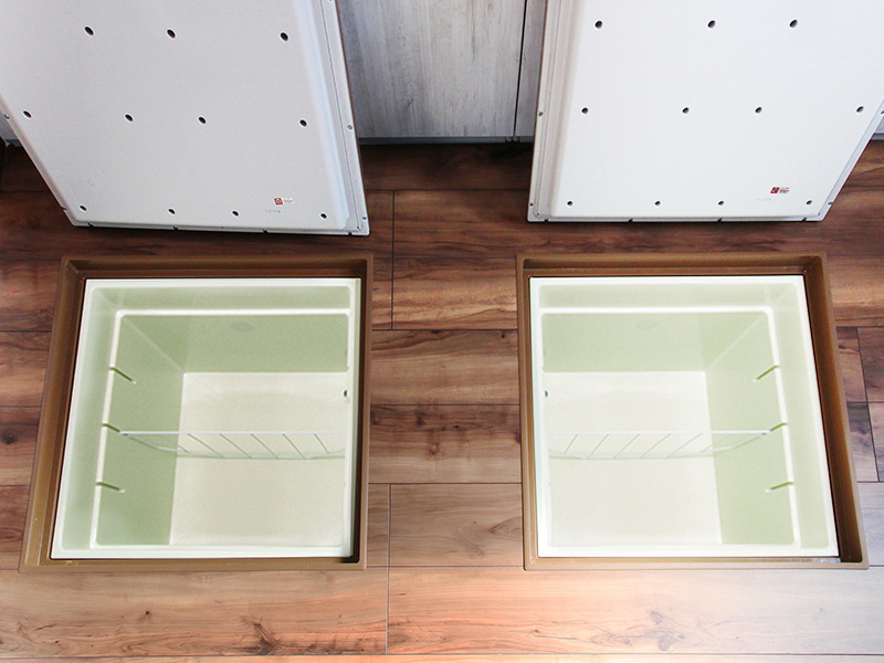 キッチンの足元からサッとストック品を取り出せるW床下収納。