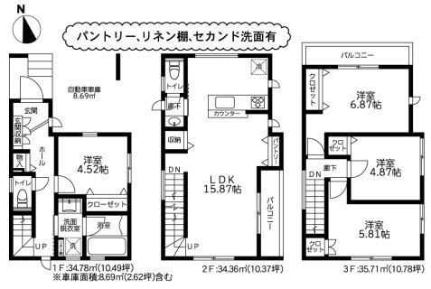 | 間取 | 4LDK (洋室4.52帖、LDK15.87帖、洋室6.87帖、洋室5.81帖、洋室4.87帖) | ||